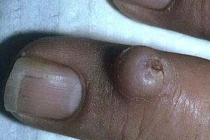Околоногтевая фиброма (опухоль Кенена) – это опухолевидное образование, расположенное на пальце у основания ногтевой пластины, на кожных валиках, иногда под ногтем. Является одним из признаков системного заболевания — туберозного склероза. К симптомам последнего относят неврологические расстройства в виде поражения головного мозга и пятна на коже, но фиброма — это первый прогностический признак. Рост опухолей Кенена начинается в подростковом возрасте. Обычно размеры их в пределах 1 см, но есть и гигантские. Околоногтевые фибромы не сопровождаются неприятными ощущениями, хотя при неудачном расположении могут оказывать давление на окружающие ткани, вызывая боль.