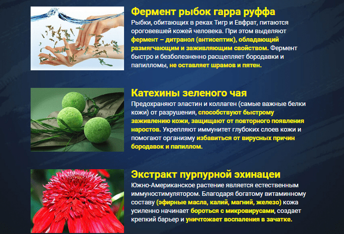 Рыбка гарра руфа отвечает за безопасное и безболезненное удаление наростов. Эти существа употребляют ороговевшую кожу, тем самым способствуя ее обновлению, поэтому их фермент избавляет от бородавок и папиллом без шрамов и рубцов. Кроме этих компонентов, гель содержит: