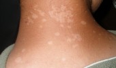 - Отрубевидный лишай – хроническое повреждение рогового слоя эпидермиса грибковой инфекцией. Она вырабатывает азелаиновую кислоту, что снижает способность меланоцитов синтезировать пигмент. Клинически проявляется в виде множественных, мелких, светлых пятен на спине с четкими границами. Причины, способствующие появлению лишая: изменение pH кожи (подростковый возраст, синтетическая одежда), снижение иммунитета, УФ-излучение и гормональный сбой. Заболевание требует внимания специалиста, поэтому не занимайтесь самолечением.