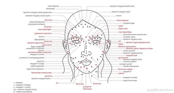 - Левая бровь. Новообразование в этом месте говорит о противоположном — неудаче в браке.